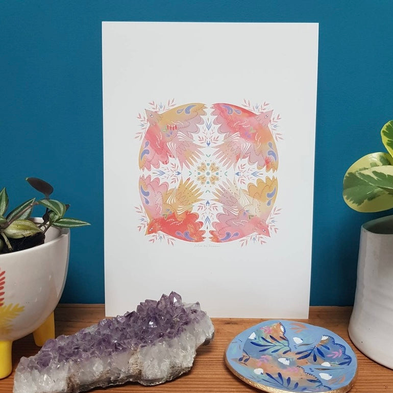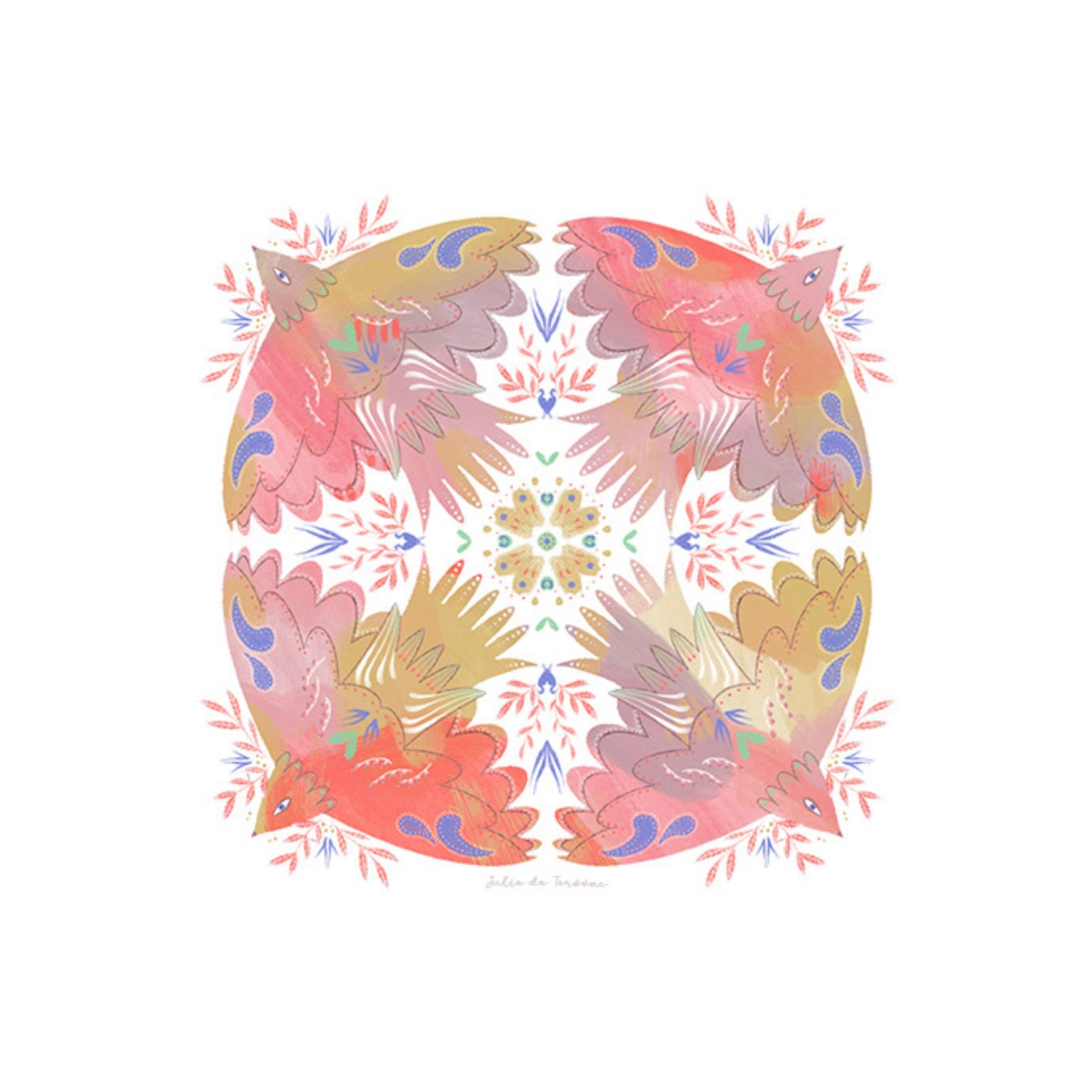 Dans cette création délicate, Julie de Terssac associe l’élégance des oiseaux à la fraîcheur d’un motif floral riche en détails. Une composition joyeuse et apaisante qui évoque la nature, la liberté et les liens du cœur.