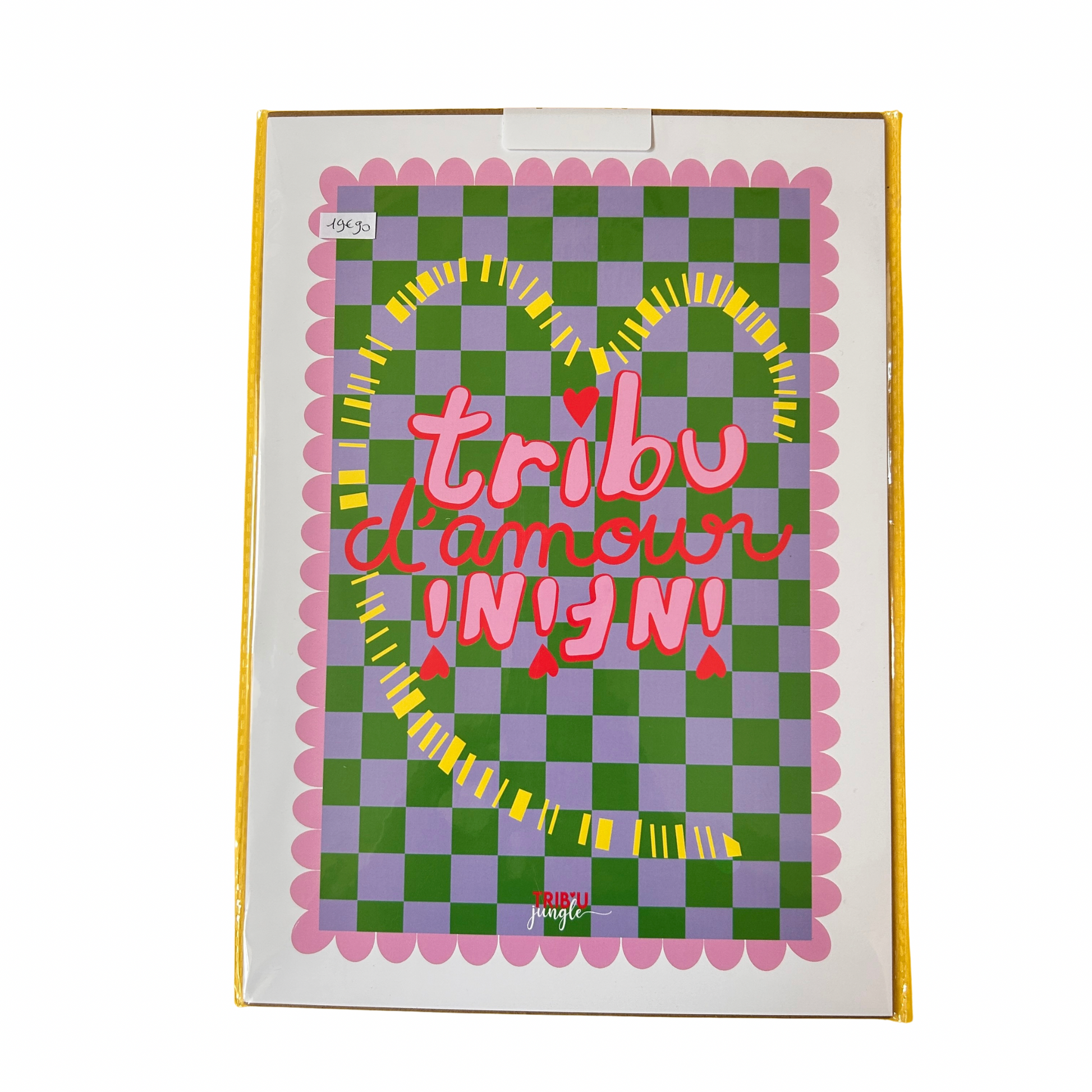 Apportez de la tendresse, du peps et une dose d’amour infini à vos murs avec l’affiche « Tribu d’amour INFINI ». Un design vibrant au style graphique unique signé La Tribu Jungle, pour une déco pleine de fun et de sens !