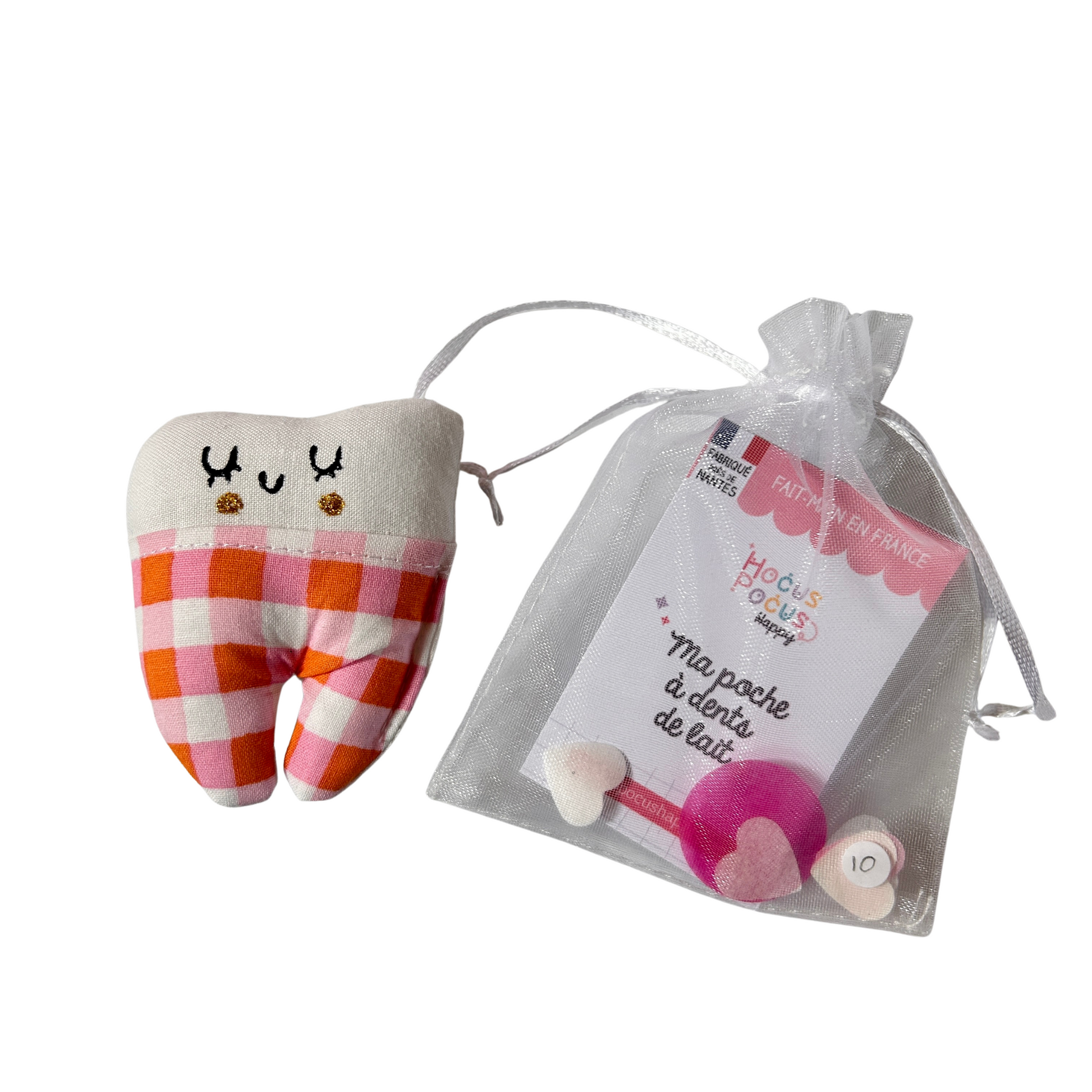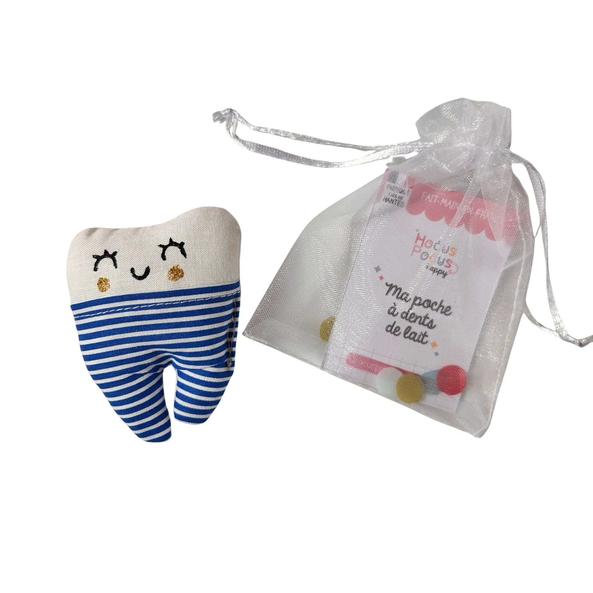 Glissez la dent de lait dans la poche en tissu à motif et attendez sagement le passage de la petite souris ou de la fée des dents, qui y déposera à son tour une petite pièce !