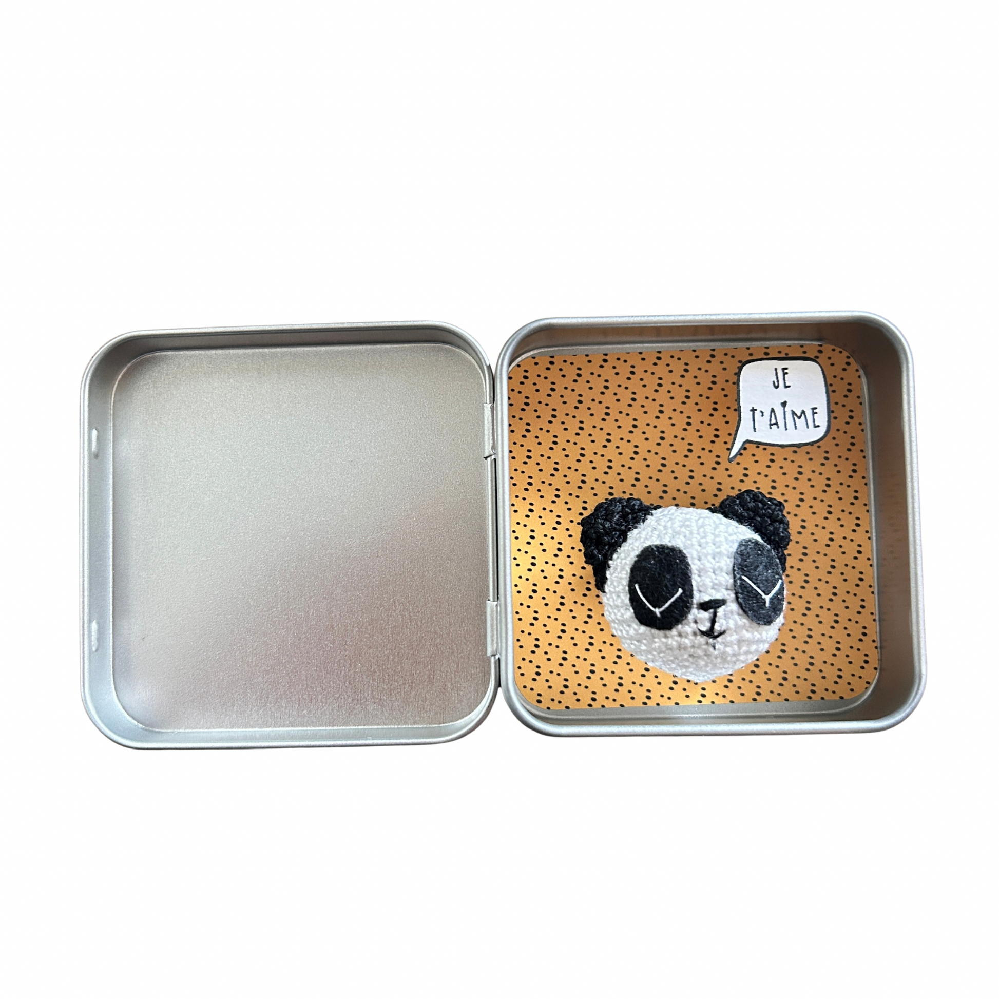 Chaque boîte est unique, avec son animal en crochet et son mot doux personnalisé. Compacte et légère, elle se glisse facilement dans un cartable, un sac ou une poche pour être emportée partout.