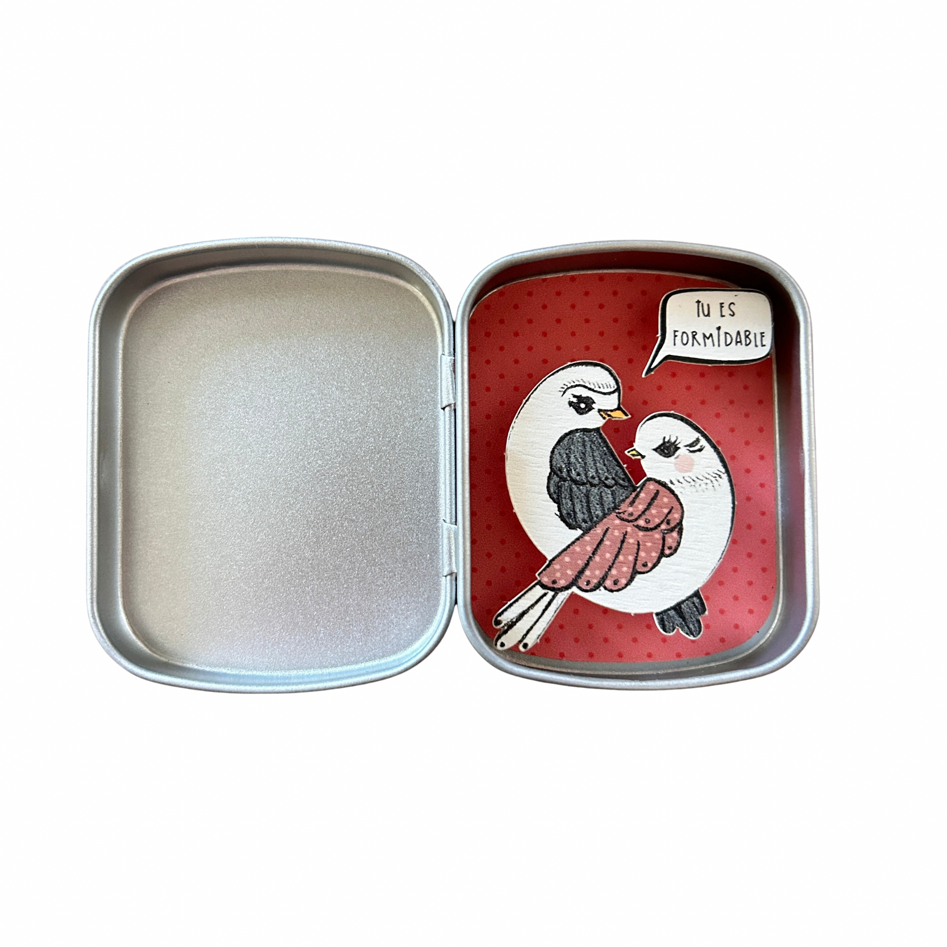 Chaque boîte est unique, avec son illustration en papier et son mot doux personnalisé. Compacte et légère, elle se glisse facilement dans un cartable, un sac ou une poche pour être emportée partout.