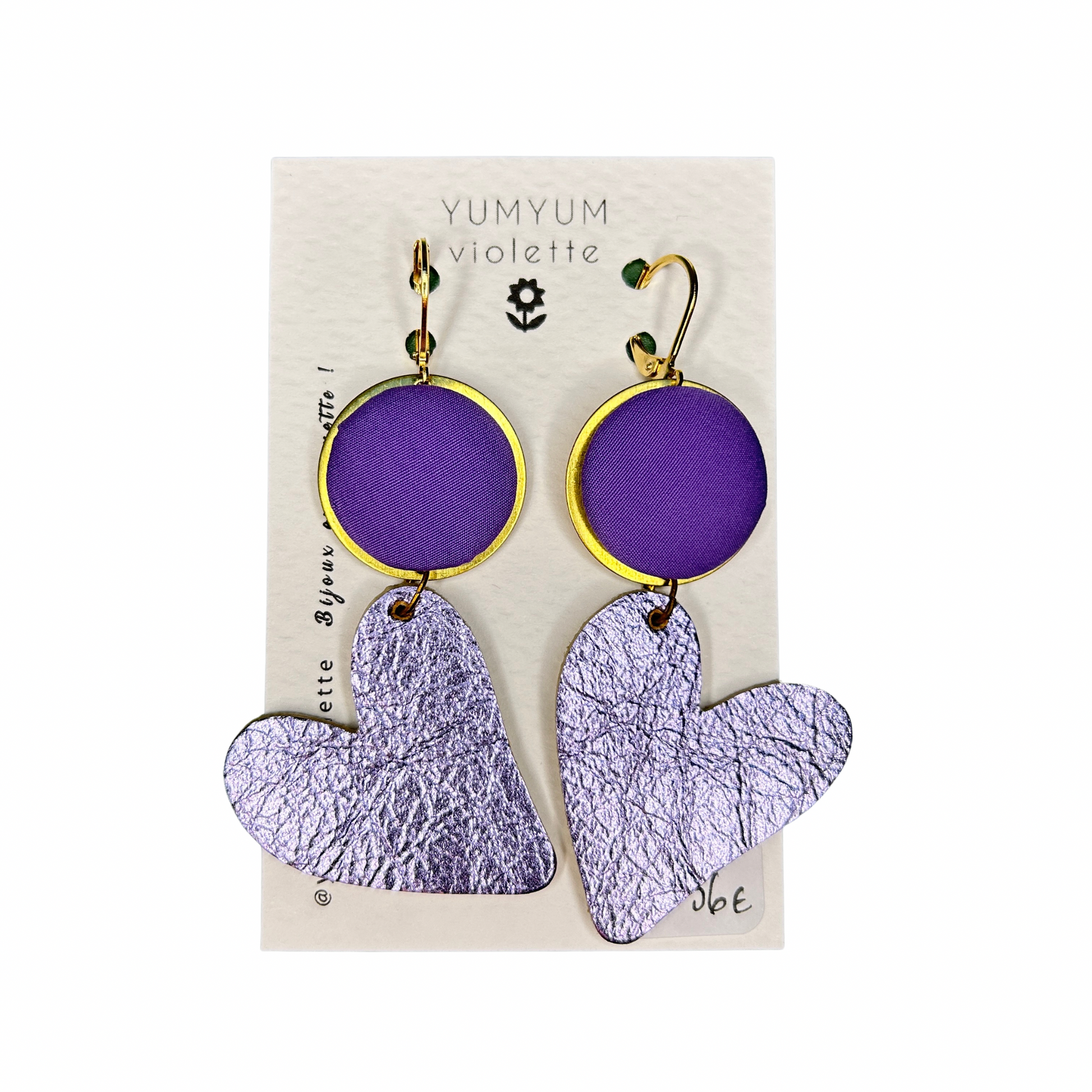 Ces boucles d’oreilles en forme de petite coeur mélangent cuir métallisé et textile coloré, pour un contraste vibrant et moderne.
