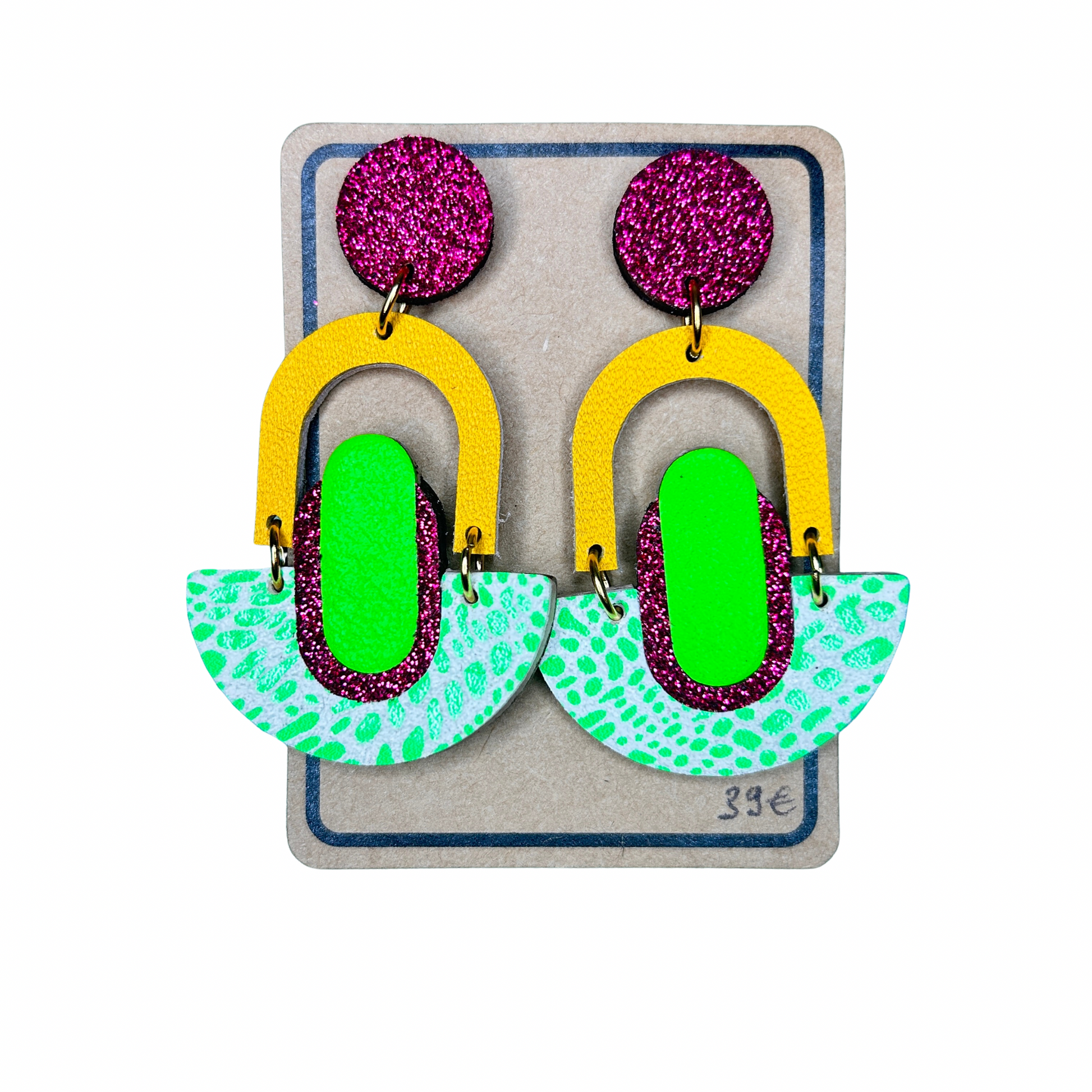 Apportez une touche de couleur et de modernité à votre look avec les boucles d’oreilles Osulis. Chaque paire se distingue par son design géométrique unique et ses teintes hyper colorées qui font vibrer votre style. Les clous sont en acier inoxydable, garantissant confort et tenue pour toute la journée. Les bijoux sont fabriqués à partir de cuir de qualité, léger et agréable à porter.