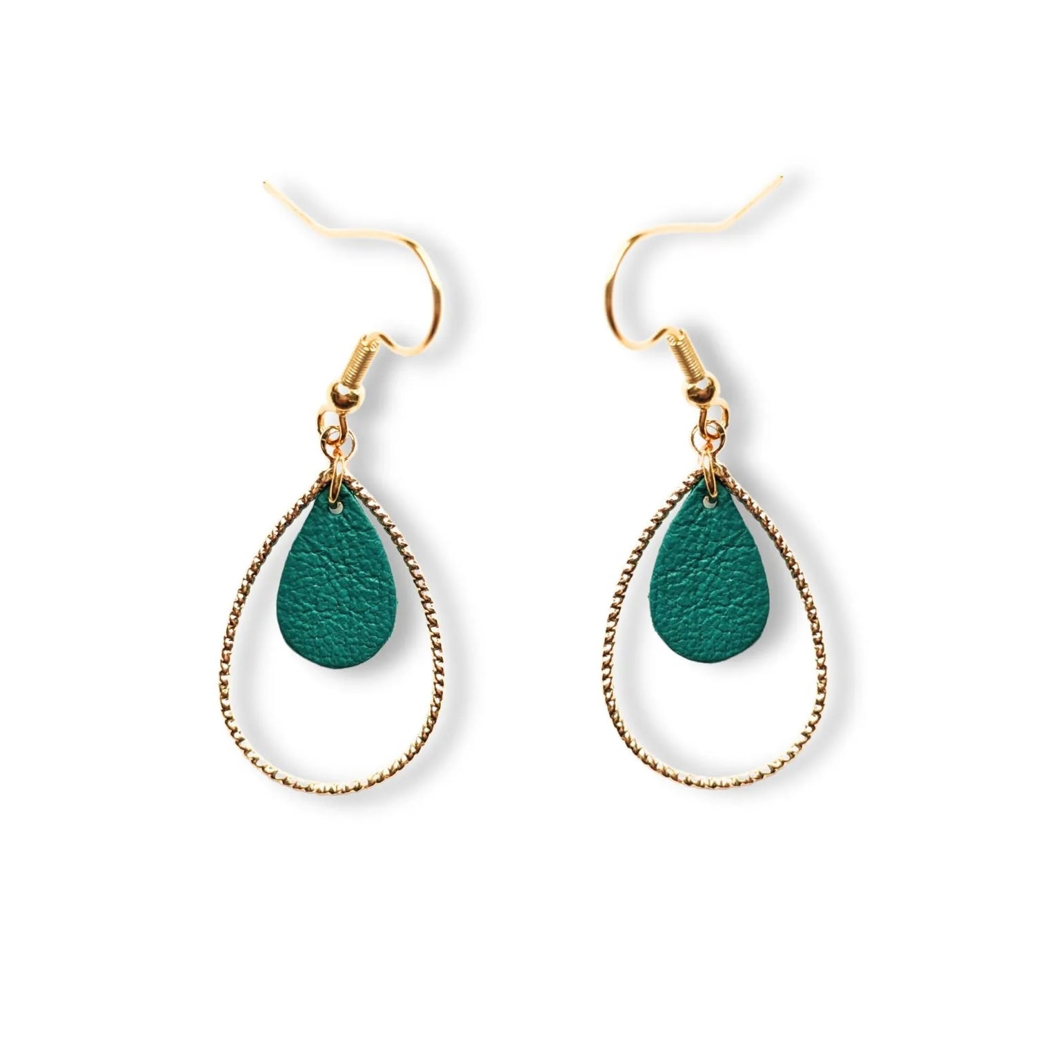 Les boucles d’oreilles Goutte associent une goutte ciselée dorée à l’or fin à une goutte en cuir recyclé.