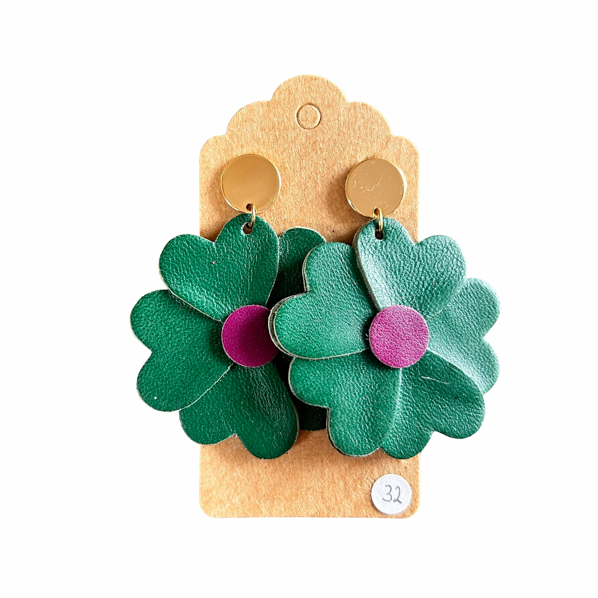 Profitez d'un style unique avec ces boucles d’oreilles marguerites en cuir, découpées et assemblées à la main.
