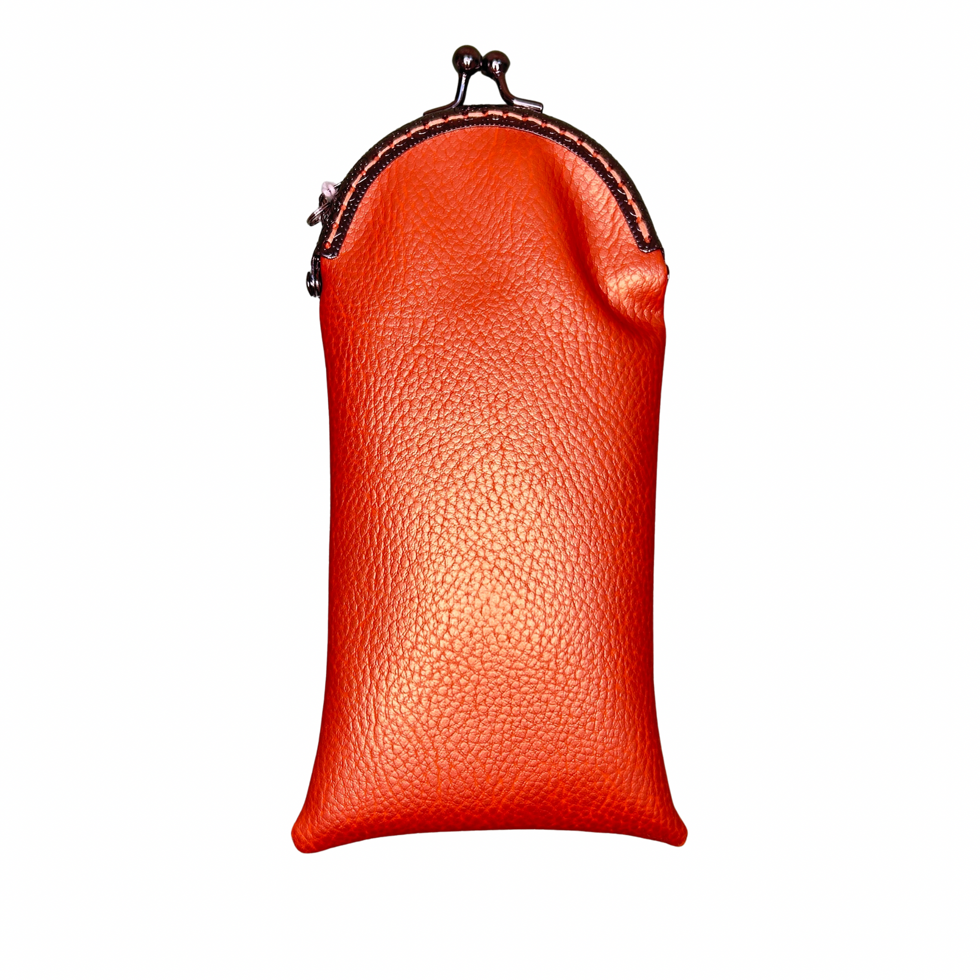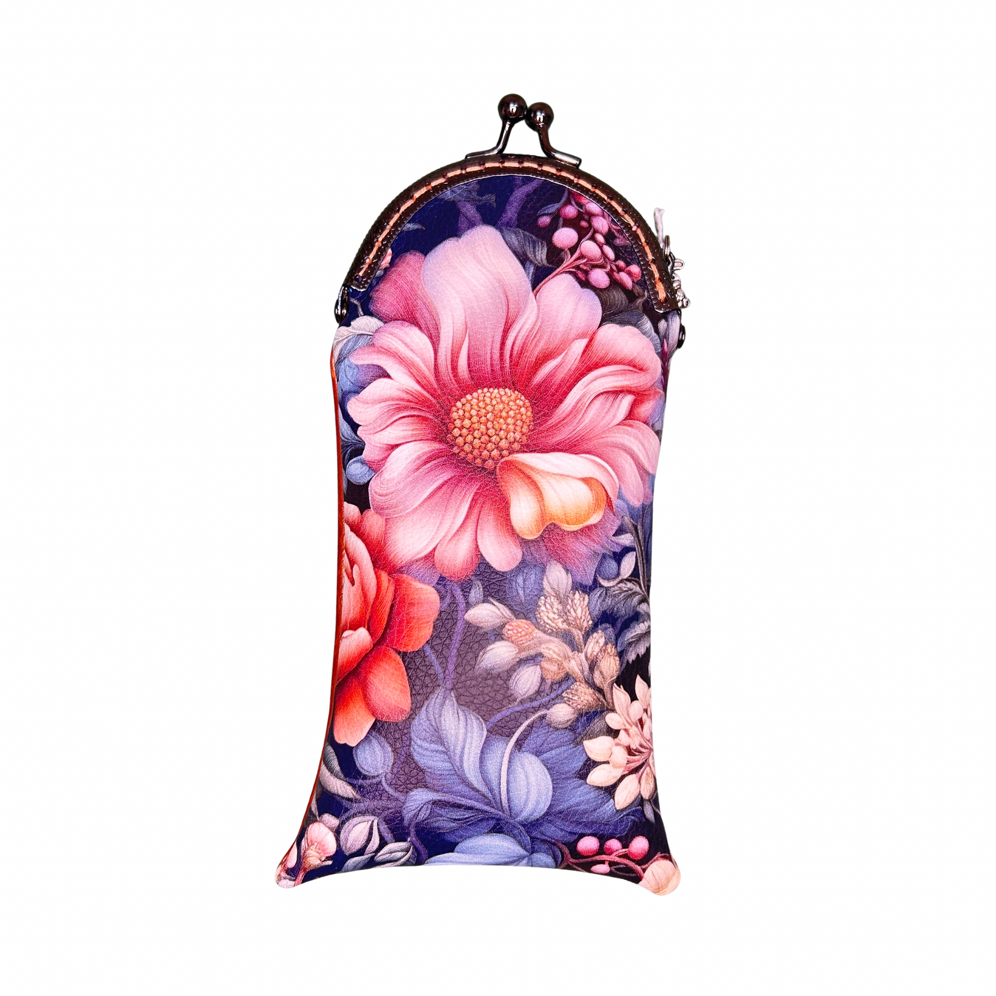 Cet étui associe un similicuir orangé lumineux à un tissu floral délicat, pour un rendu frais, élégant et intemporel. Grâce à son fermoir rétro métallique façon minaudière, il offre un maintien sécurisé tout en apportant une touche chic et vintage.