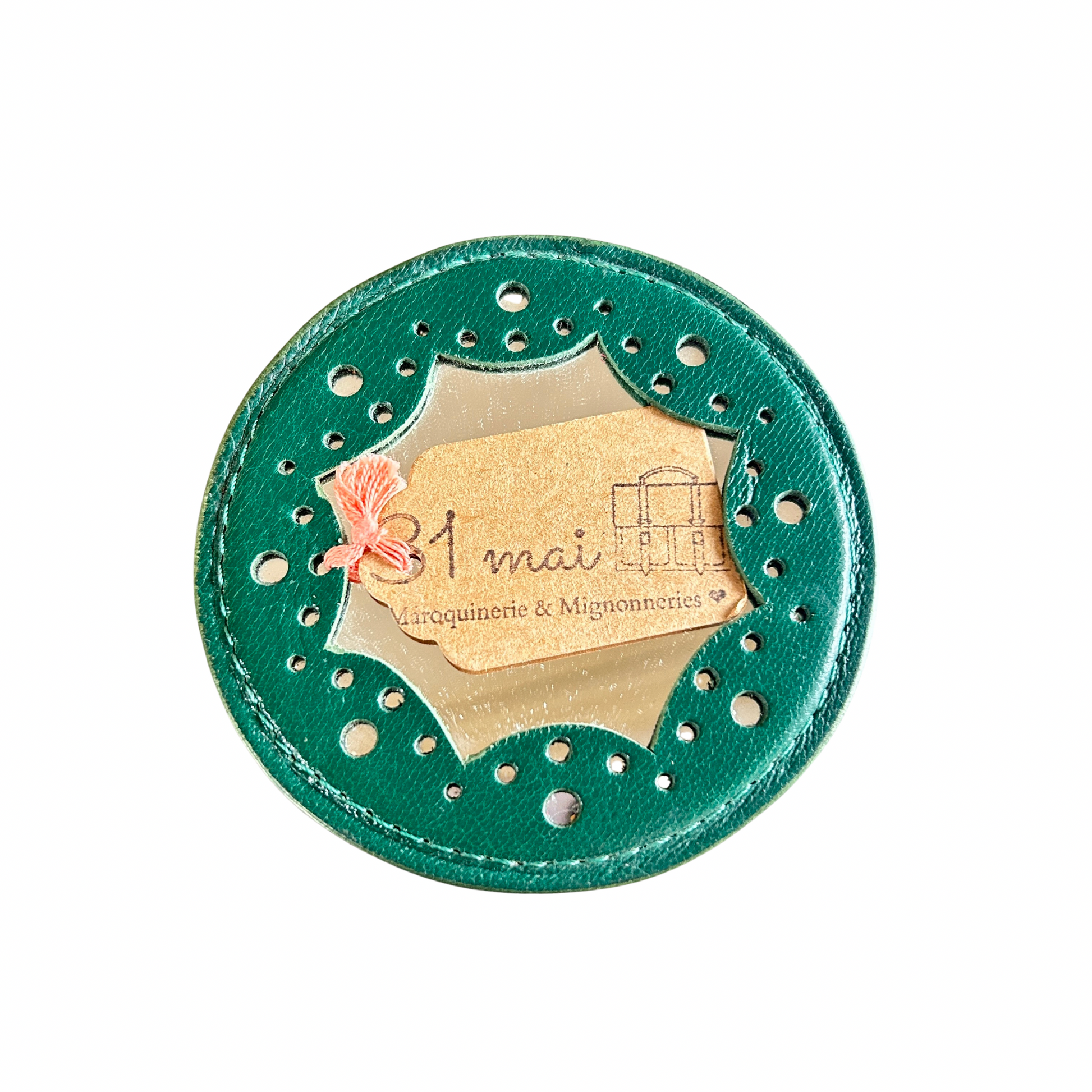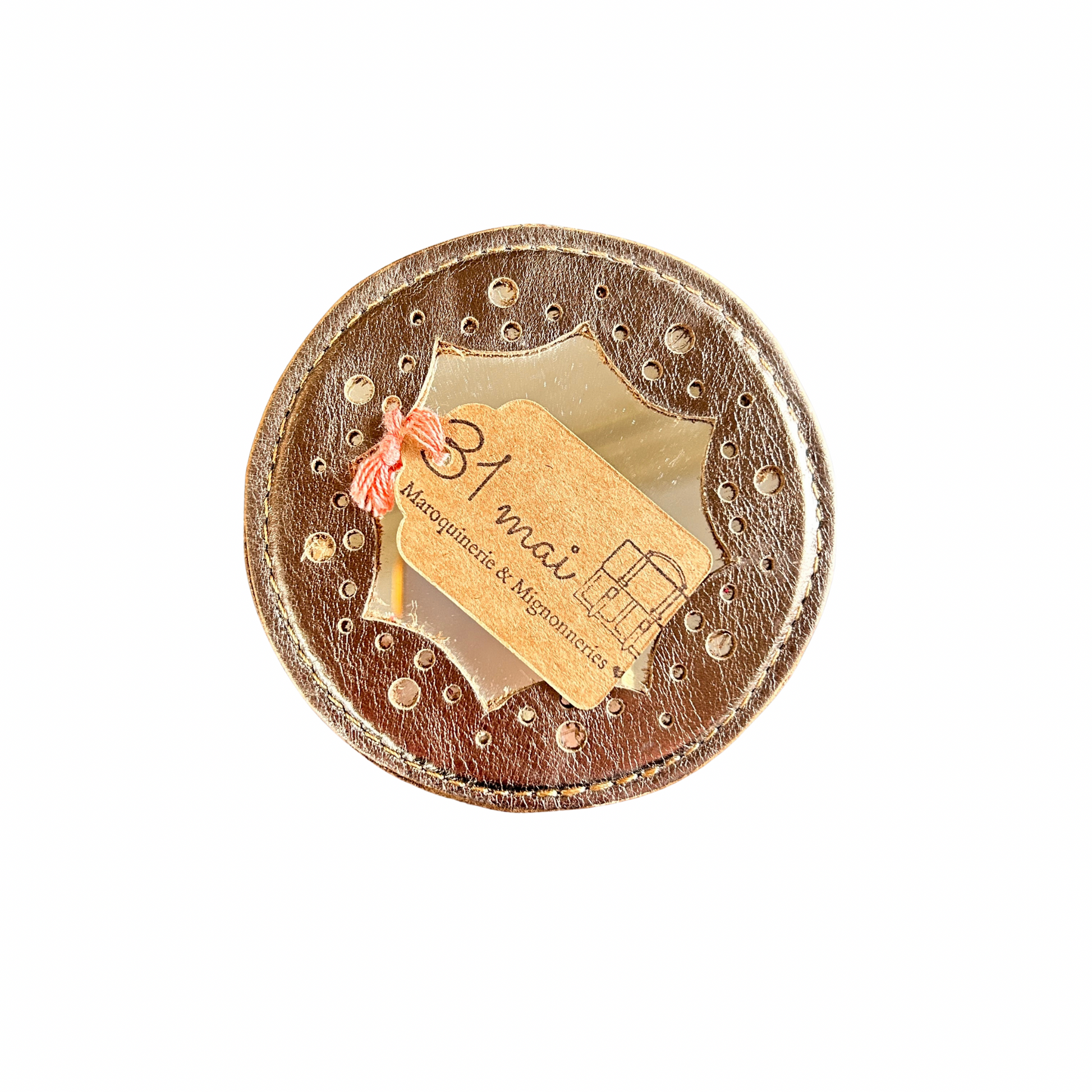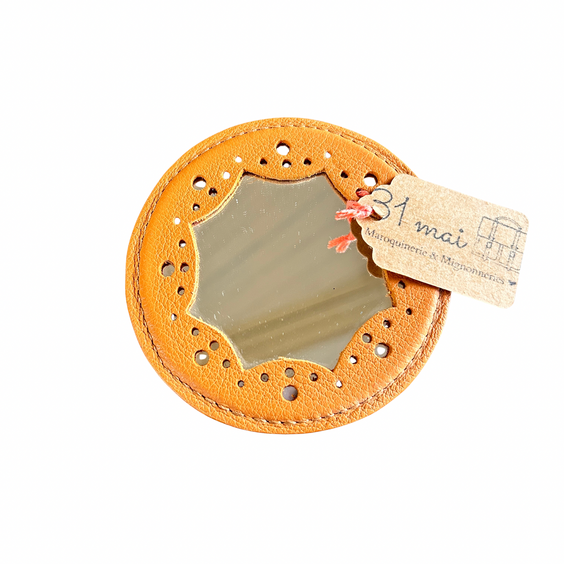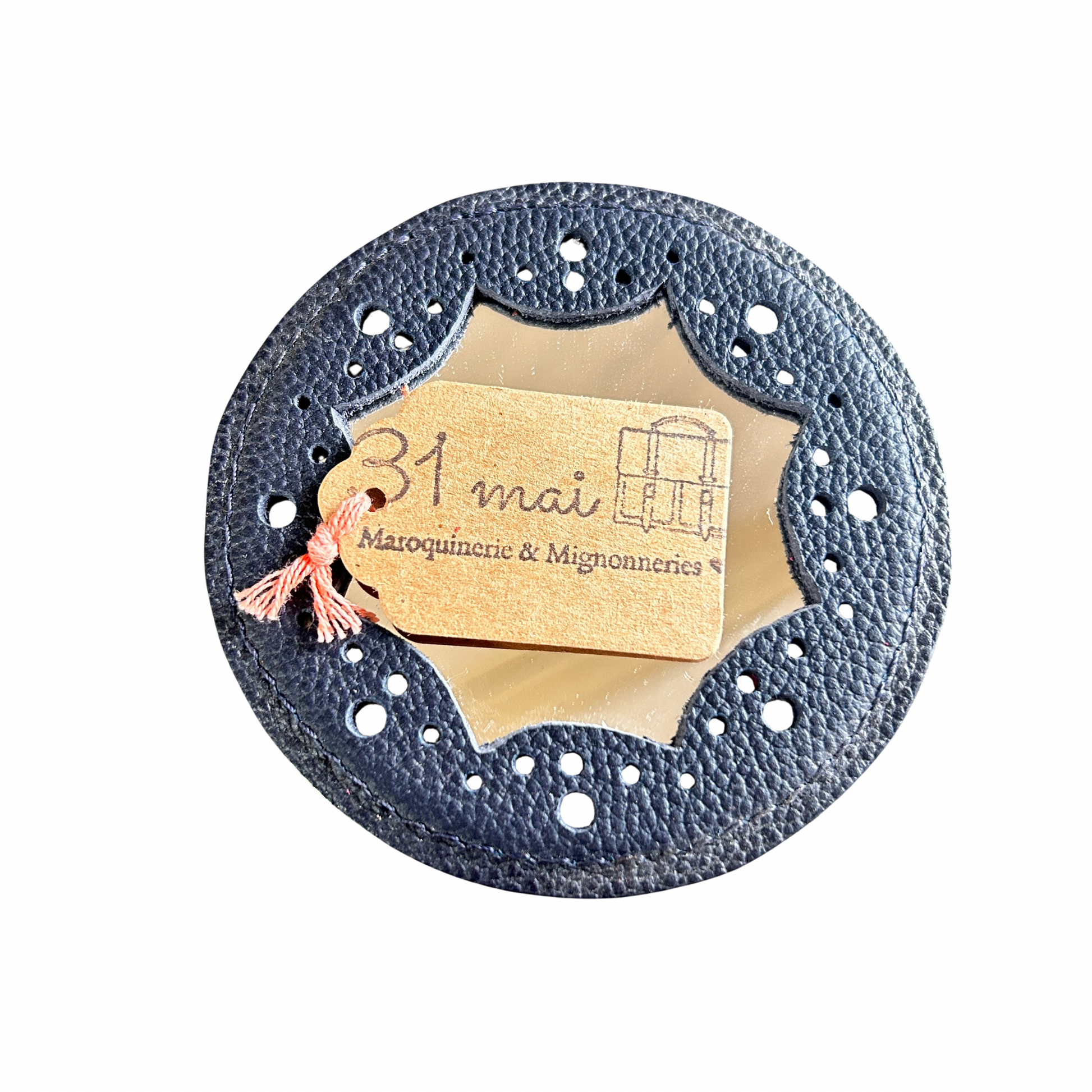 Ce miroir de poche en cuir de vachette a un diamètre de 9 cm.