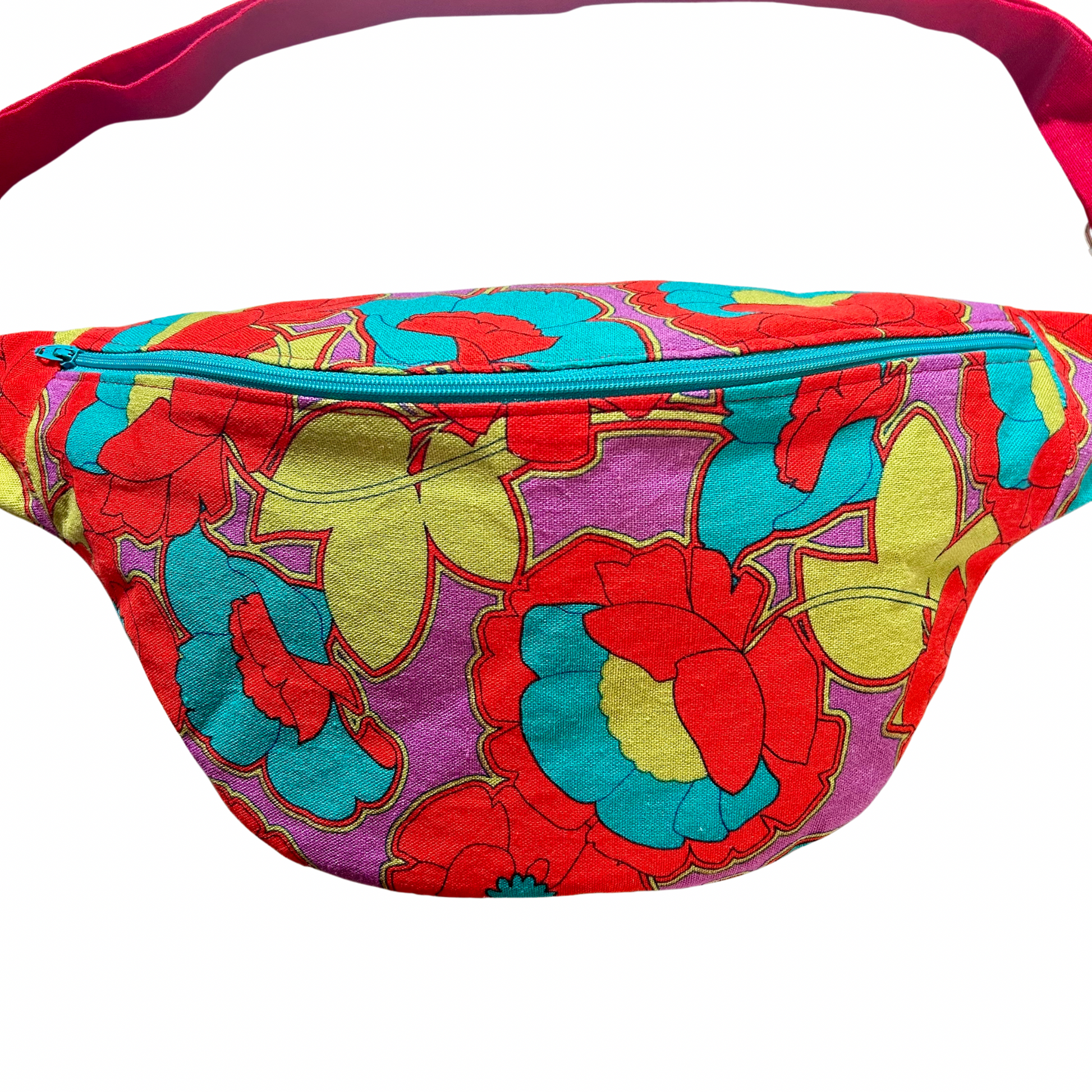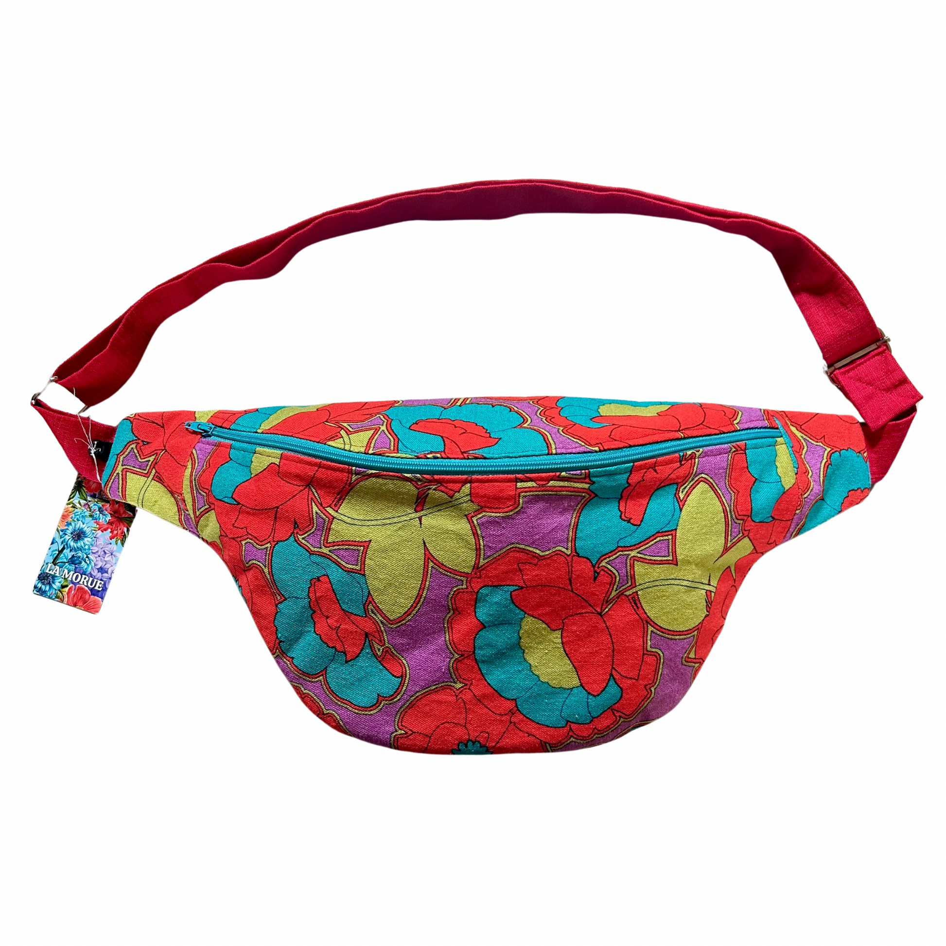 Extérieur : tissu violet motifs grosses fleurs multicolores / Intérieur : ramie rouge/ Anses : ramie rouge / Zip : turquoise