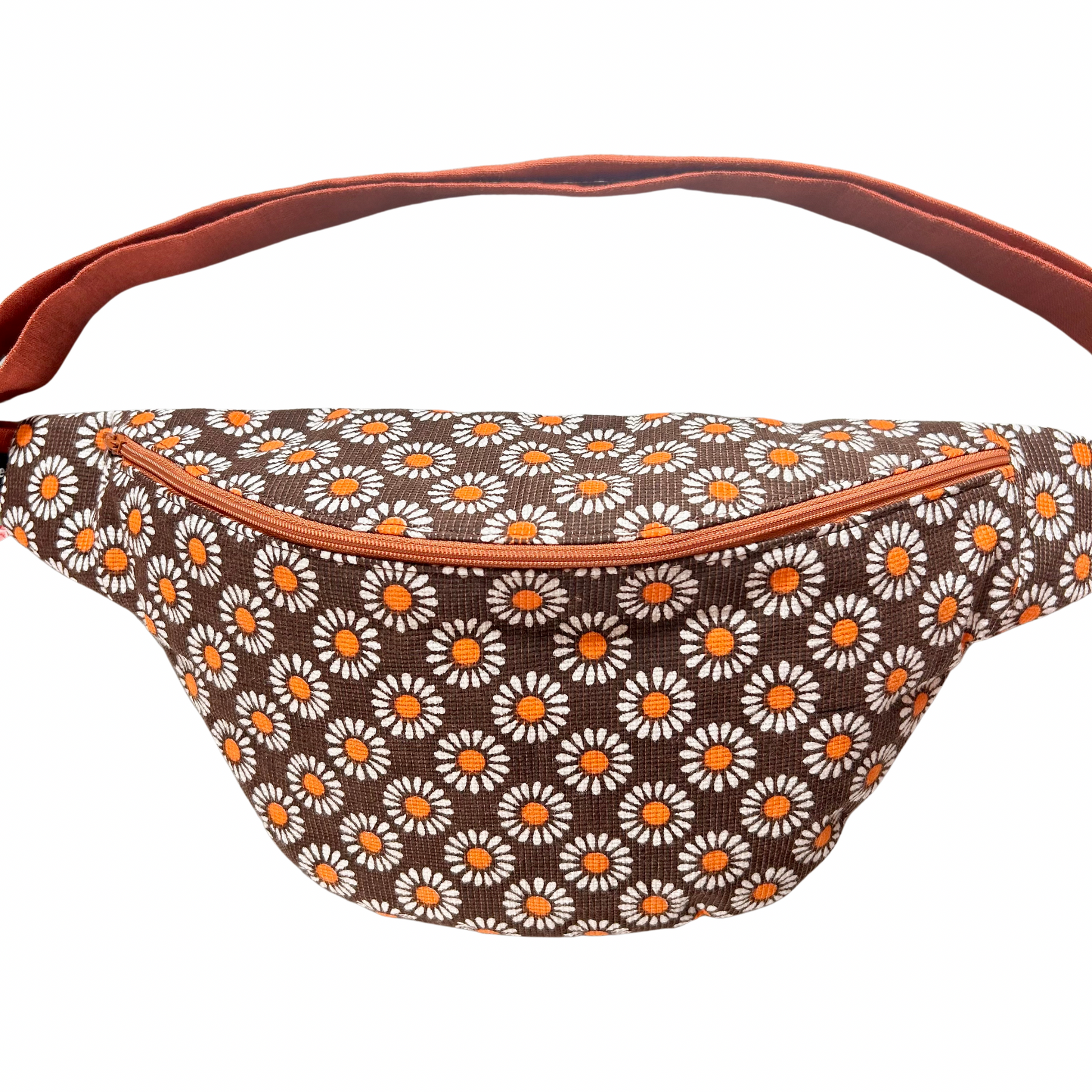 Extérieur : marron à motifs marguerites blanches/ Intérieur : terracotta / Anses : terracotta / Zip : marron ou orange